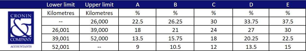The CO2 emissions category of the vehicle is as below: Example: An employee has a company car on the 1st of January 2023. The OMV (open market value) of the company car is €20,000. Due to the new tax relief, the OMV of the car can be reduced by a further €10,000, bringing the value of the car to €10,000. The car produces 85g/km in CO₂ emissions, putting the company car into Category B. The kilometres in the year were 38,000. Going by the charts above, the BIK is equal to €10,000 (OMV) x 21% (% for CO2 emissions category B vehicles that have business mileage between 26,001 and 39,000 kilometres). The BIK calculation according to new changes would be €10,000 x 21% = €2,100.